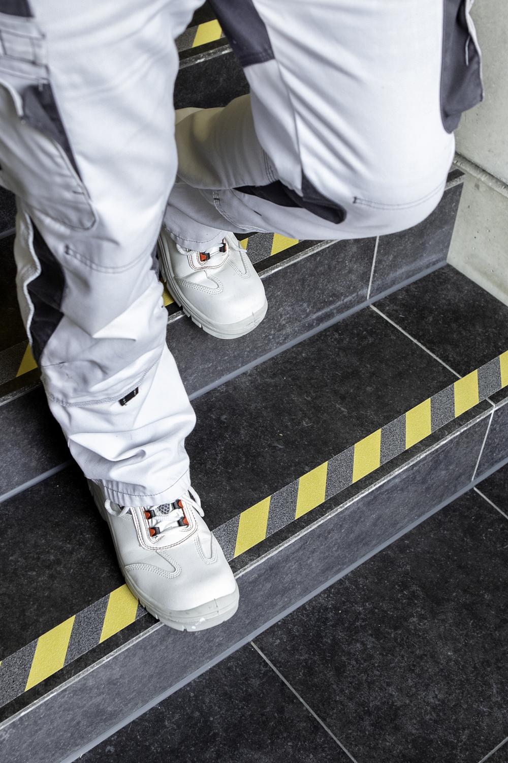 The anti-slip tape is a high-quality adhesive tape with a PVC carrier and aluminum oxide coating. It can be used both indoors and outdoors and is UV and salt water resistant. Thanks to its good adhesive strength on a wide variety of surfaces, it offers slip resistance, for example on steps, ladders, ramps, machines, vehicles or construction sites.